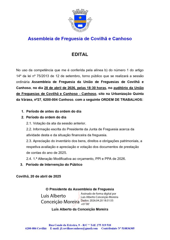 ASSEMBLEIA DE FREGUESIA | 28 de abril de 2026 | 18H30 ASSEMBLEIA DE FREGUESIA | 28 de abril de 2026 | 18H30